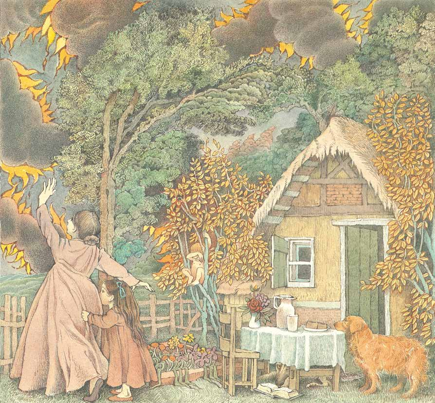 故事裡,母親為了讓女兒躲避戰爭讓她躲進森林裡。