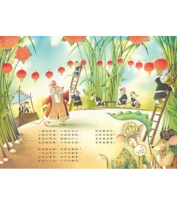 一場熱熱鬧鬧的廚藝大賽用了兩個跨頁,一個個步驟由作者郝廣才以韻文講出中菜料理的功夫,文字中有音樂,就像煮菜要有節奏,寫得流暢又透徹,看得人垂涎三尺!這群渴望成為鼠女婿的料理好手們,手勢和動作都非常講究,繪者朱里安諾的功力在這裡嶄露無遺。